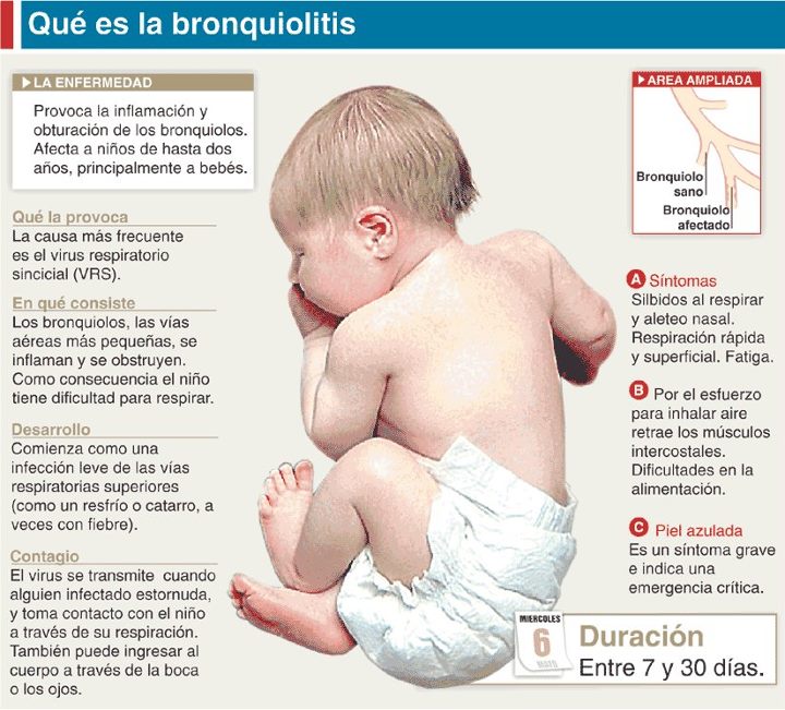 En los casos graves, los síntomas pueden empeorar con rapidez. Un niño con bronquiolitis grave puede cansarse por el trabajo de respirar y tener poca entrada y salida de aire en los pulmones debido al taponamiento de las pequeñas vías respiratorias. La piel puede tornarse azulada (lo que se conoce como “cianosis”), lo cual es muy notorio en los labios y las uñas. El niño también puede quedar deshidratado por el esfuerzo que realiza para respirar, por los vómitos y porque come menos.